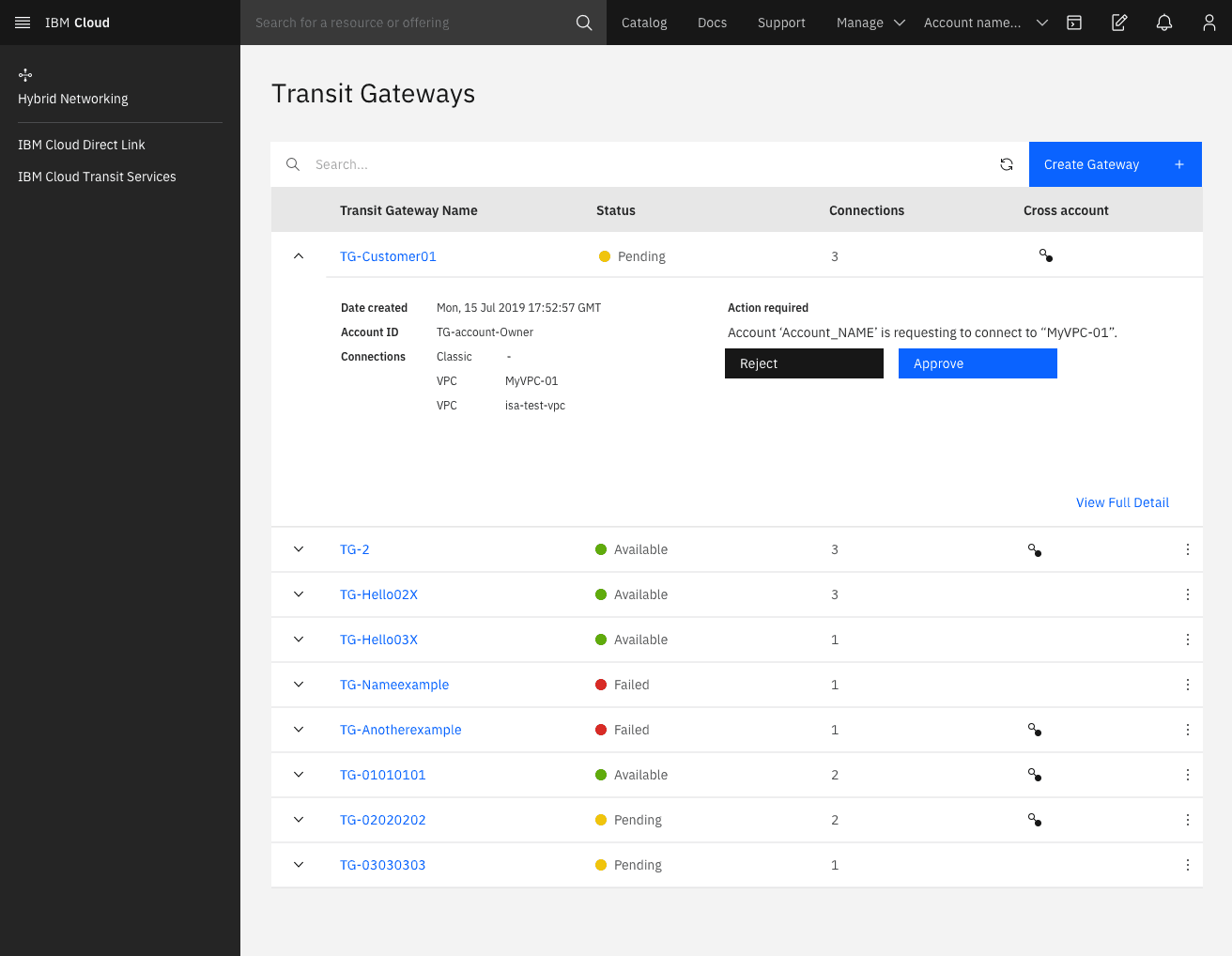 TOP LEFT — In-context actions for Transit Gateway set-up.